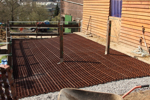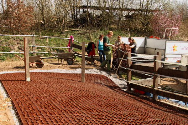 Damit der Auslauf besser befestigt ist, haben die Minis Paddockgittermatten und Sand bekommen.
